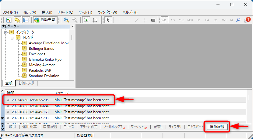 「テスト(T)」ボタンを押してもメールが送信できない場合は、MT4の下の方にある「ターミナル」の「操作履歴」タブを開いてみて下さい(下図)。